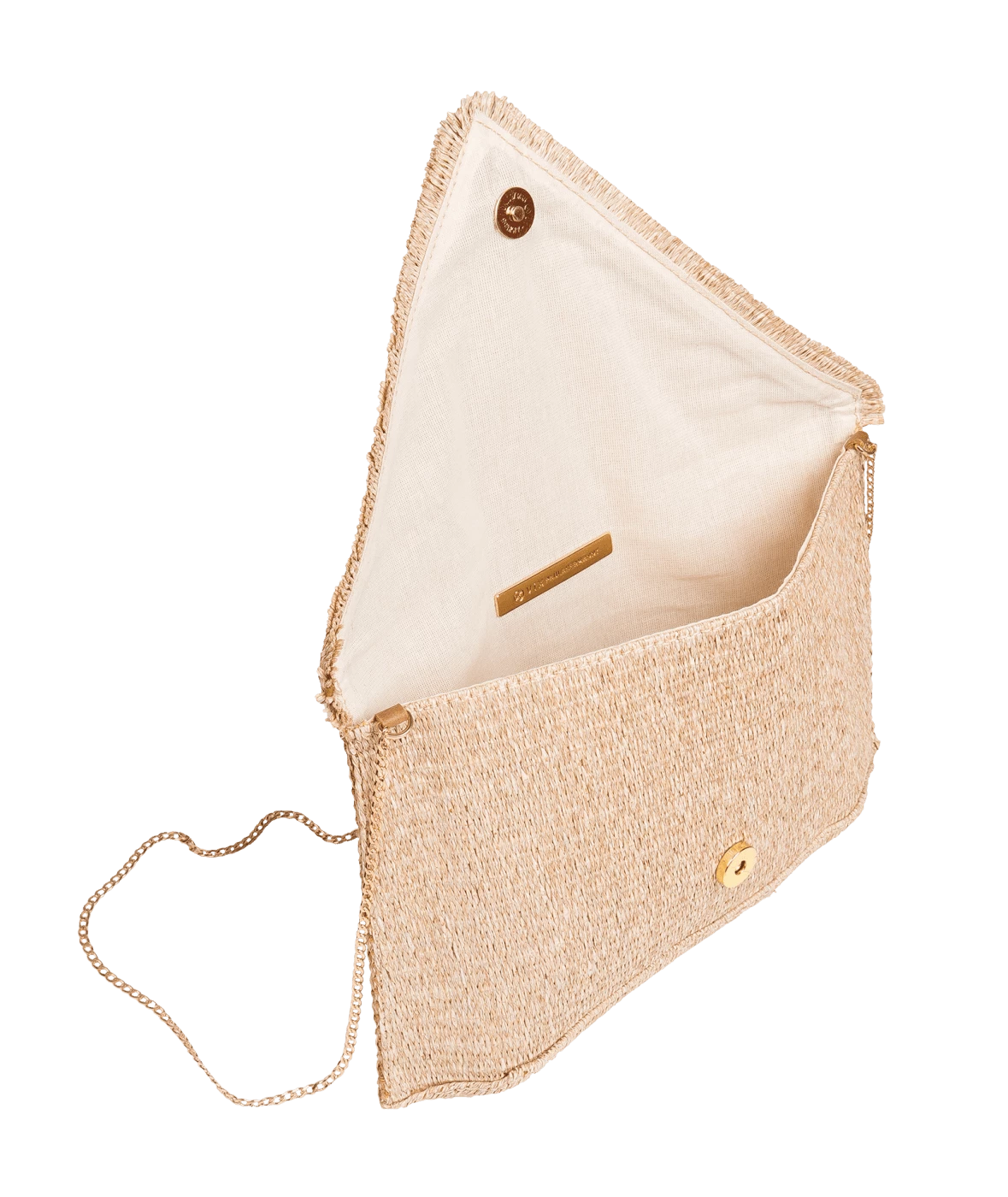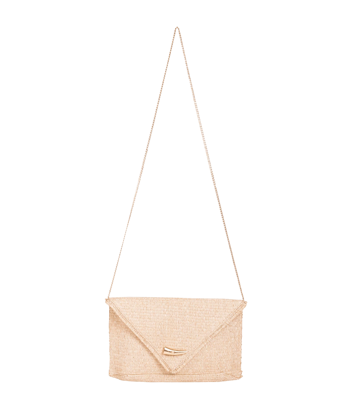 A paper straw bag with a delicate chain for a casual beach to street look.