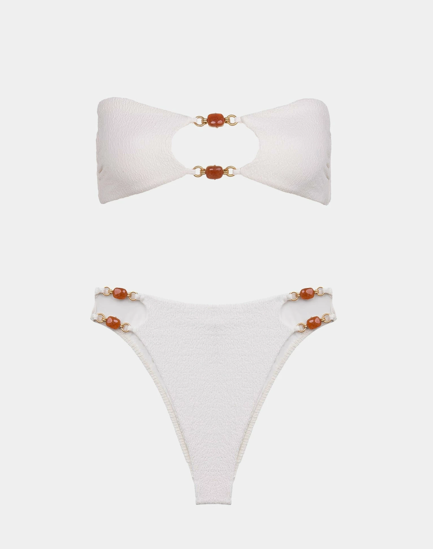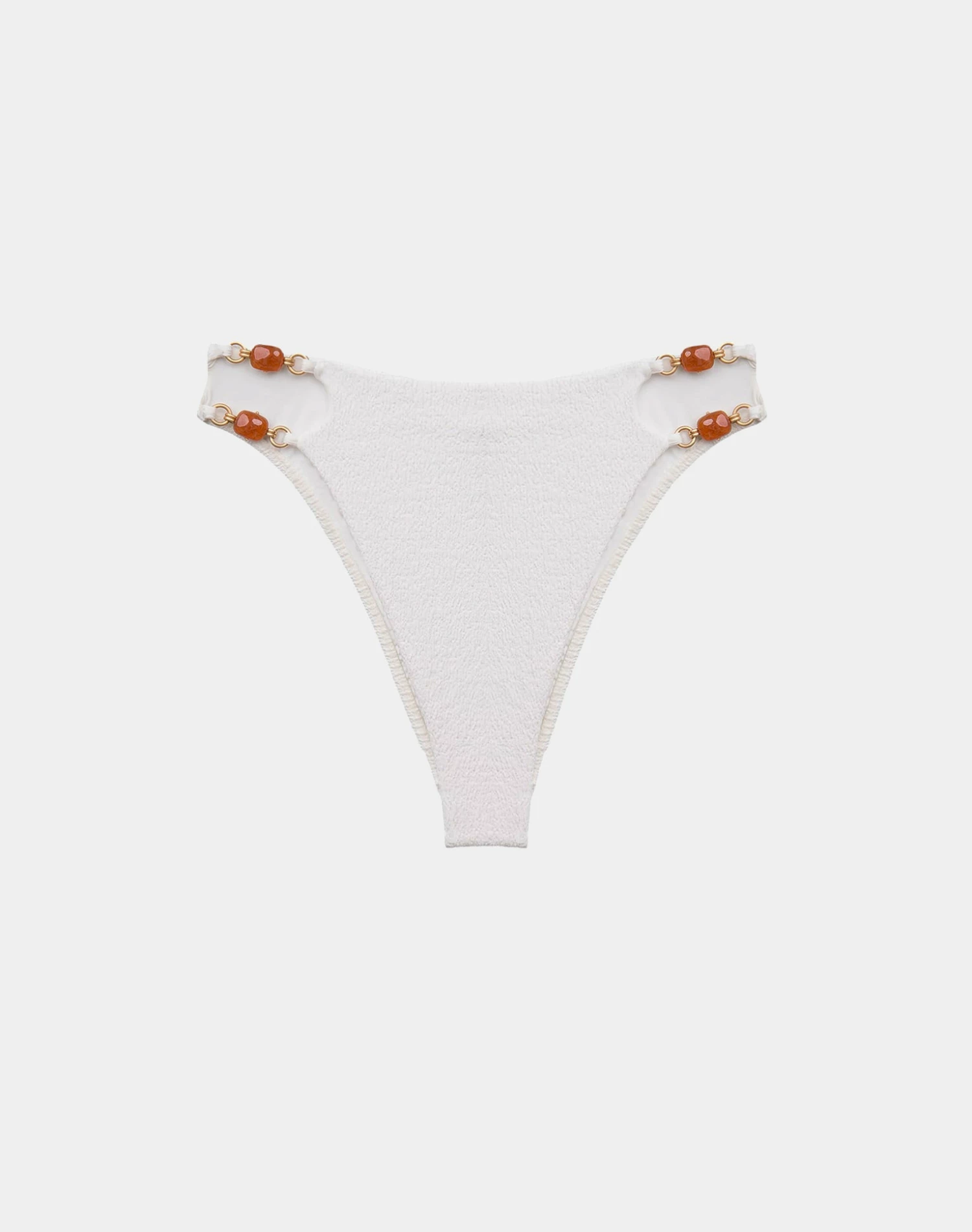 A sun craving french cut classic that promises to enhance your silhouette while keeping you styled to the nines. Designed to flatter, the Martha Hot Pant features a high-rise bodice that accentuates your waistline and is artisanally embellished with colorful stone-like resin and gold rings links constructed to provide you with a distinctive design.