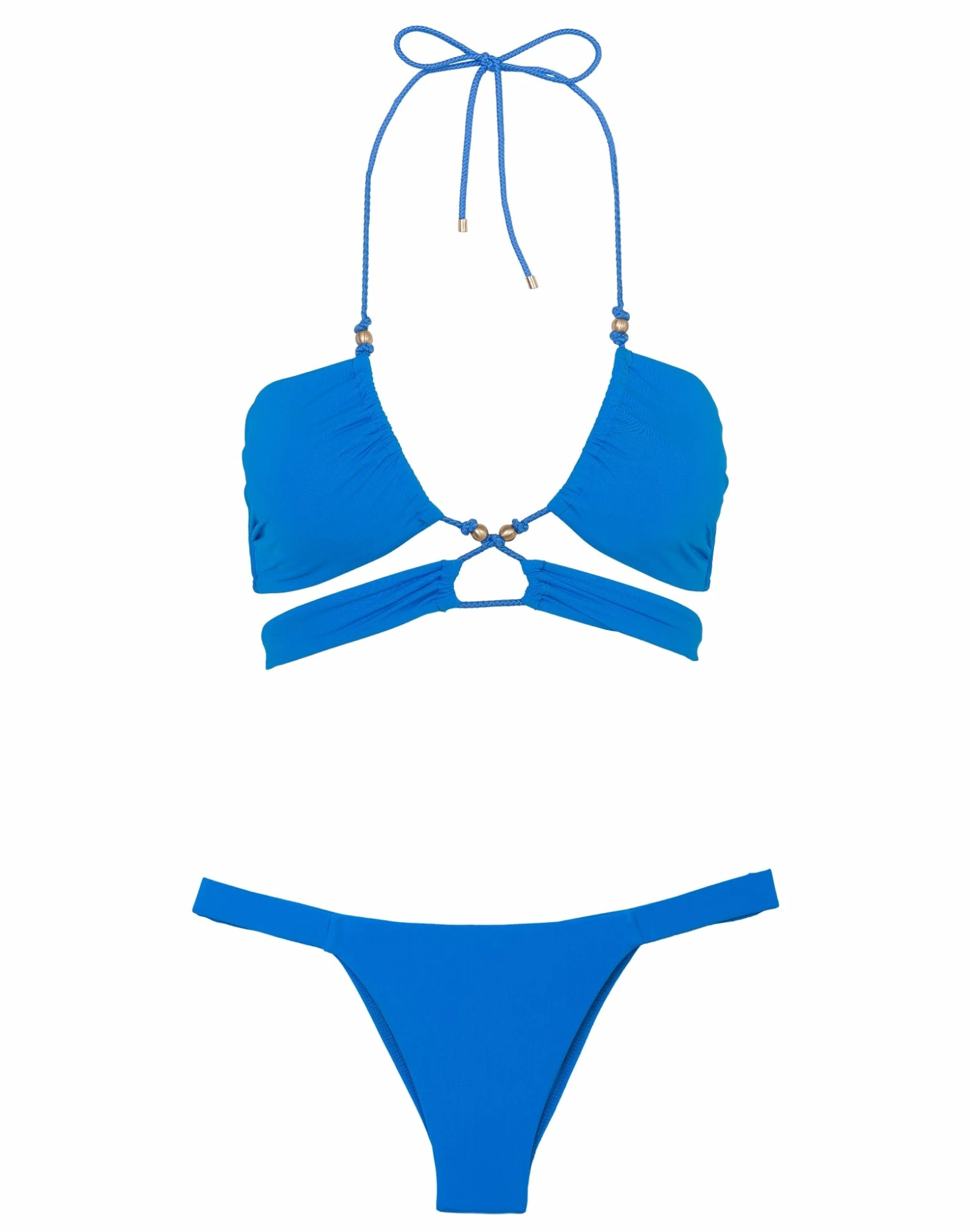 Fashion forward bikini top that embodies femininity with its curve hugging silhouette; adorned with hand-crafted 24k gold dipped charms and waxed rope center detailing. A true head turner.