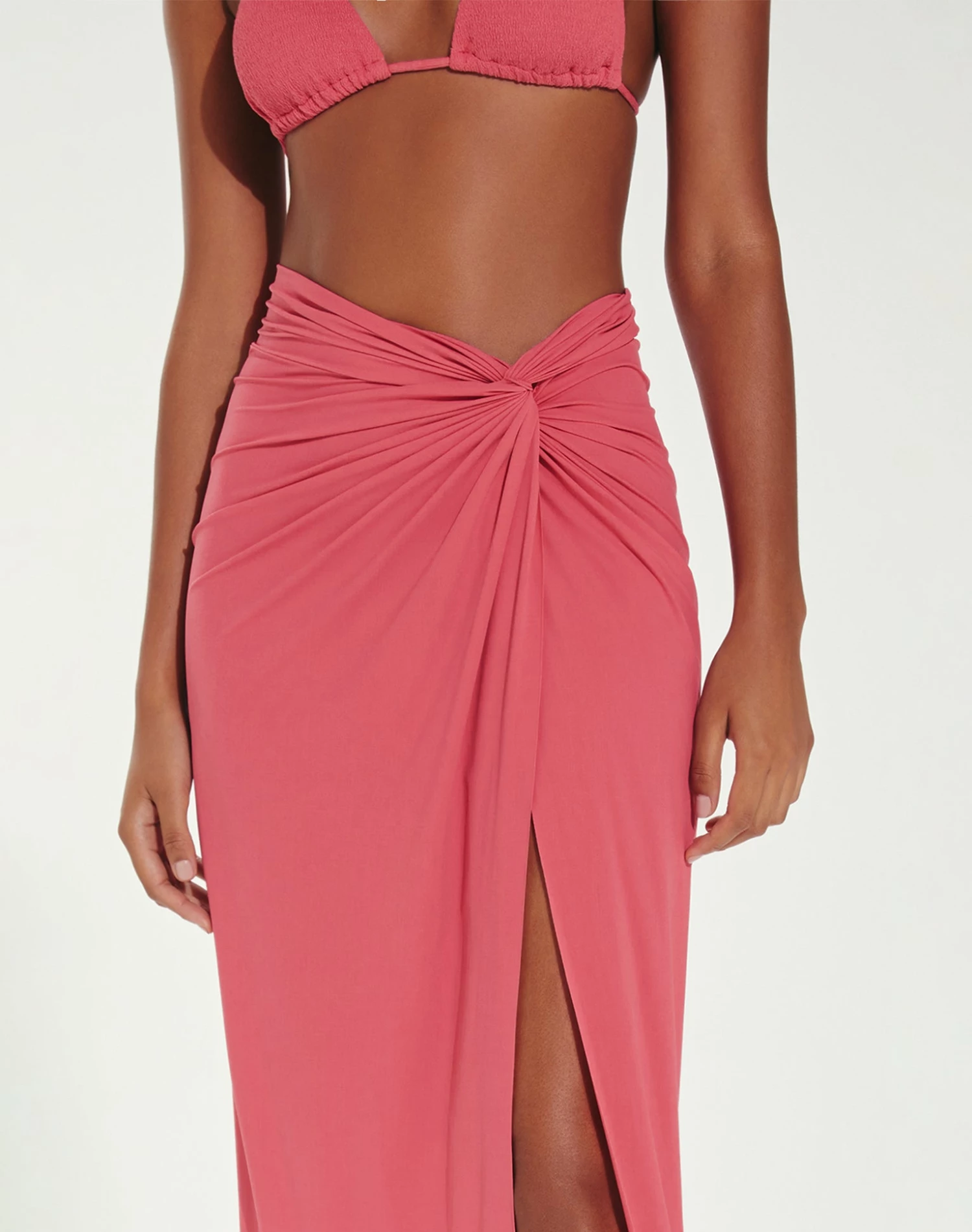 Add an extra layer of femininity to your swimwear with the Karen Midi Skirt. This sultry cover up is designed in our iconic Brazilian lycra, with a knot detail and pronounced side slit, an ideal accessory to compliment your seaside look