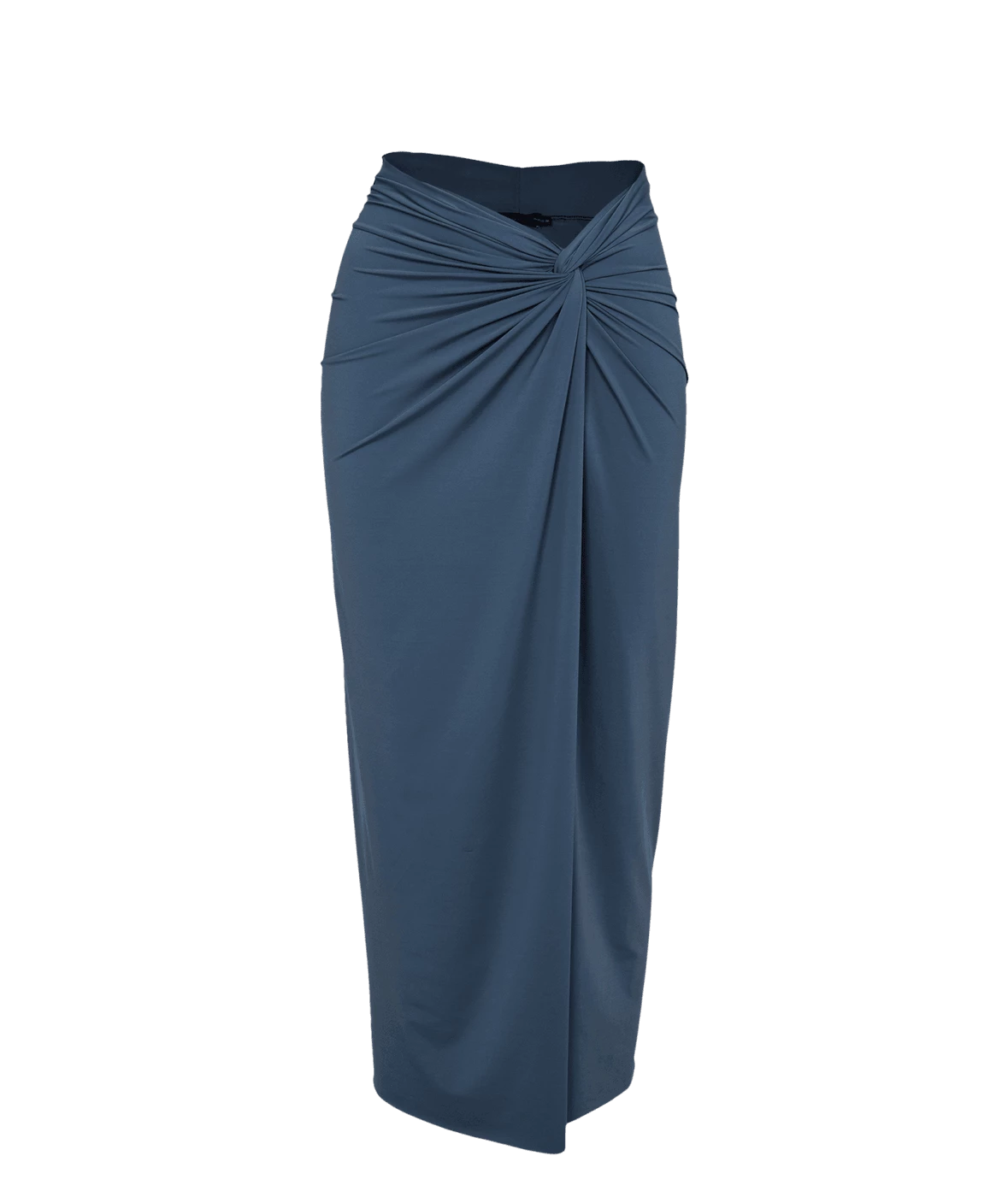 This blue grey midi skirt in a lycra feel fabric with a high front slit and knot detailing. Ideal to compliment your bikini as a cover up or pair with the Blue Grey Dune Corsage One Pc for a dress like outfit.