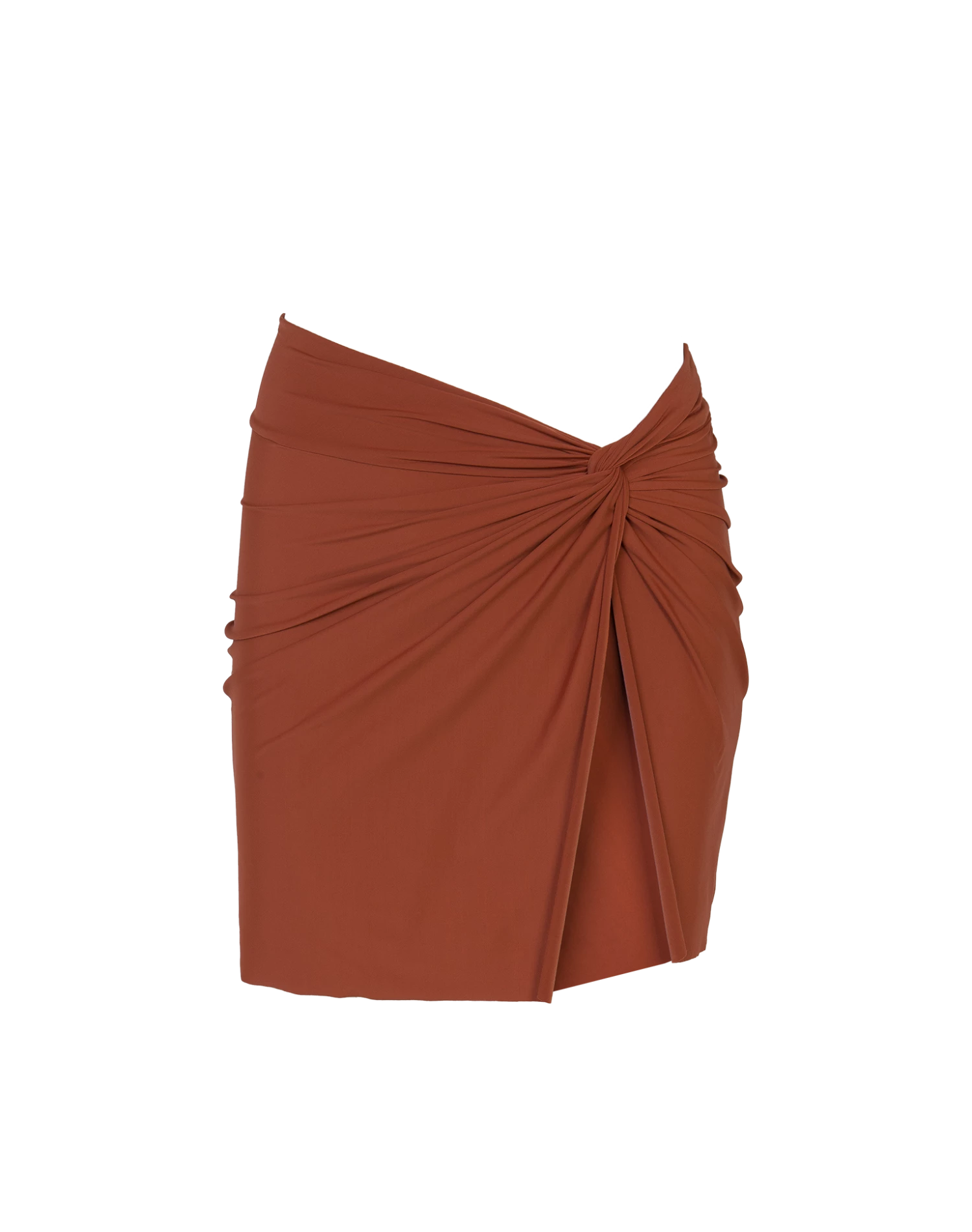 A flattering knotted side slit cover-up skirt that is flirty and bold with its silhouette and rich color.