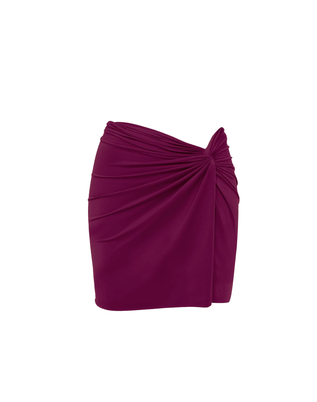 A flattering knotted side slit cover up skirt that is flirty and bold with its silhouette and rich color.