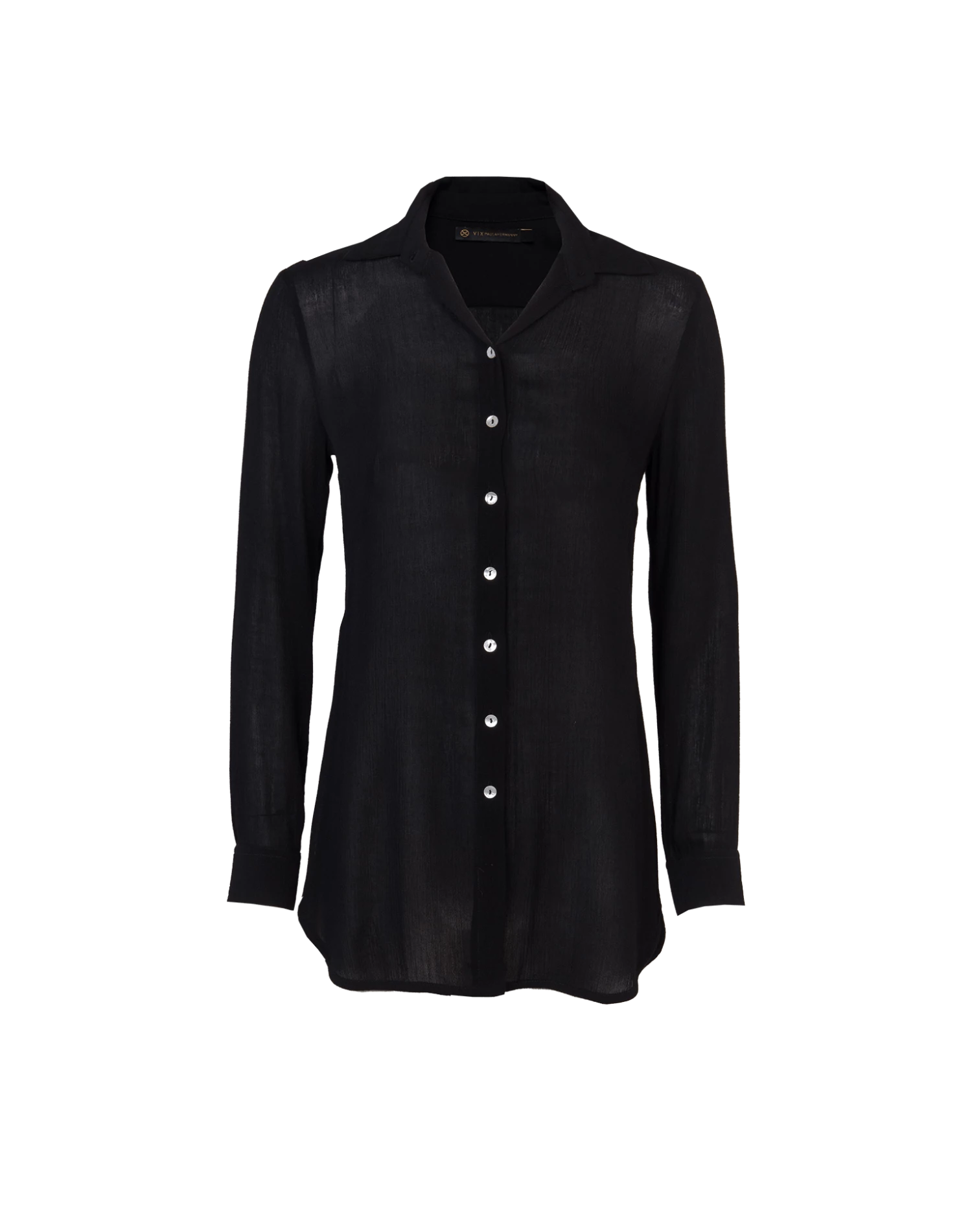 The effortlessly chic cover up that can be thrown over your bikini and transform into the evening as a blouse with trousers. Roll up the sleeves for a casual look.
