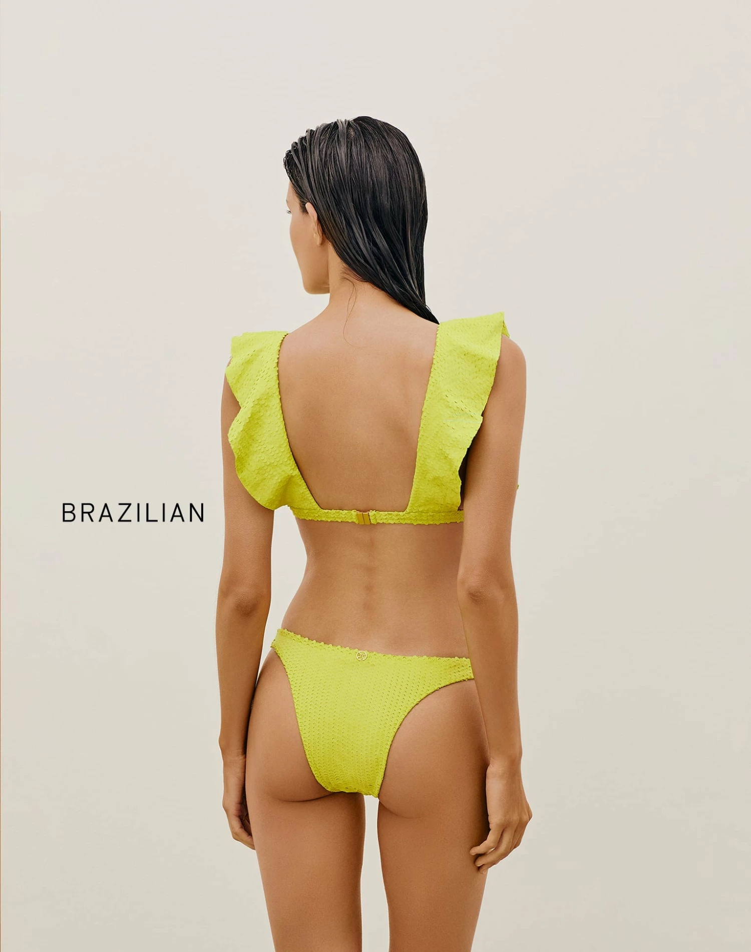 Let your femininity seep through in this flirtatious flutter bikini top. Designed in suede-like scales fabrics with a sultry plunging neckline to create a statement-making piece fit for your inner water goddess.